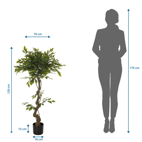 Dieser Ficus, auch bekannt als Birkenfeige oder Benjamina, ist vielseitig einsetzbar – sowohl im Innenbereich als auch im geschützten Außenbereich. Er ist eine wunderbare Alternative zu echten Pflanzen und eignet sich hervorragend für Ihr Zuhause, Büros, Gastronomien, Wartezimmer und Hotels. Mit seinem detailgetreuen Aussehen und einer hochwertigen Materialkombination aus Kunststoff und Kunstseide ist diese Kunstpflanze nahezu geruchsneutral und somit auch für Allergiker bestens geeignet. Dank des integrierten Eisendrahts lassen sich die Blätter und Stiele ganz nach Ihren Wünschen in Form biegen.
