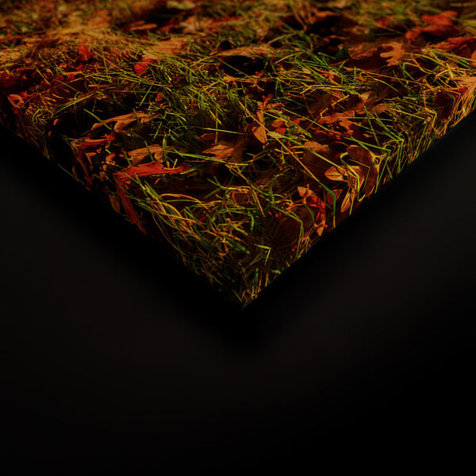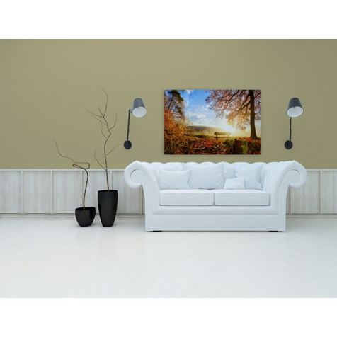 Produktinformationen "Leinwandbild 'Herbstmorgen im Laubwald' - Naturmotiv in Braun und Grün, 120 cm x 80 cm | Wandbild"